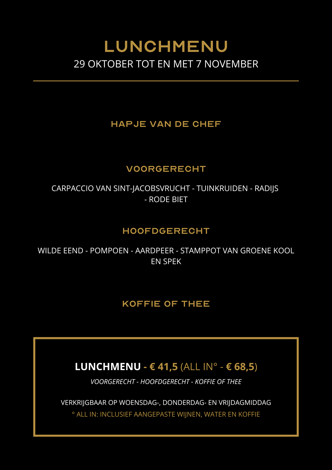 Onze chef voorziet maandelijks een nieuwe menukaart zodat je steeds weer verrast wordt met nieuwe en creatieve gerechten.